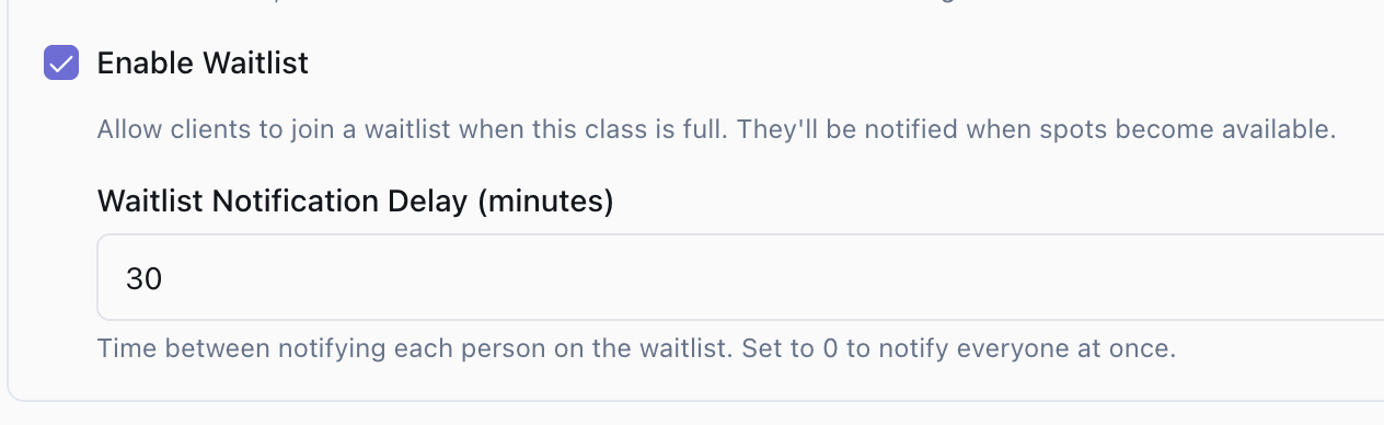 Optionally set a number of minutes to delay between sending a notification to each person on the waitlist.
